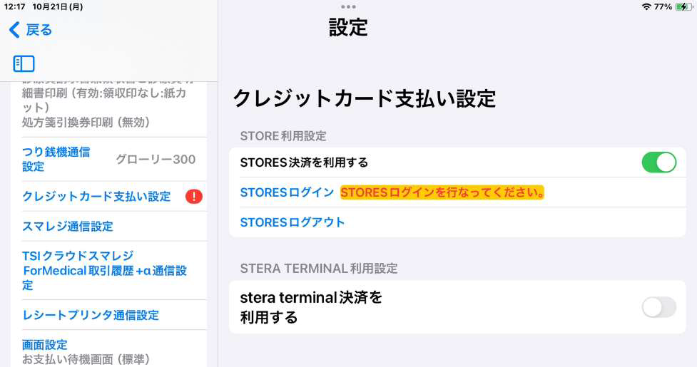 ② 「クレジットカード支払い設定」を選択し、「STORES ログイン」の状態を確認します。