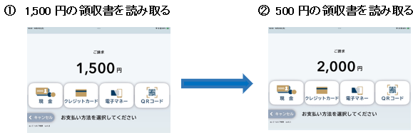 1 枚目の領収書バーコードを読み取り、金額が表示されたら2 枚目以降の領収書バーコードを読み取ります。