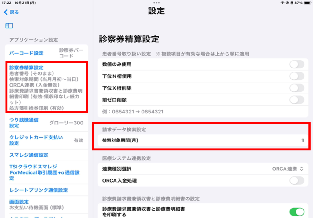 ② 「診察券精算設定」を選択し、「検索対象期間[月]」に任意の数値(月数)を入力します。